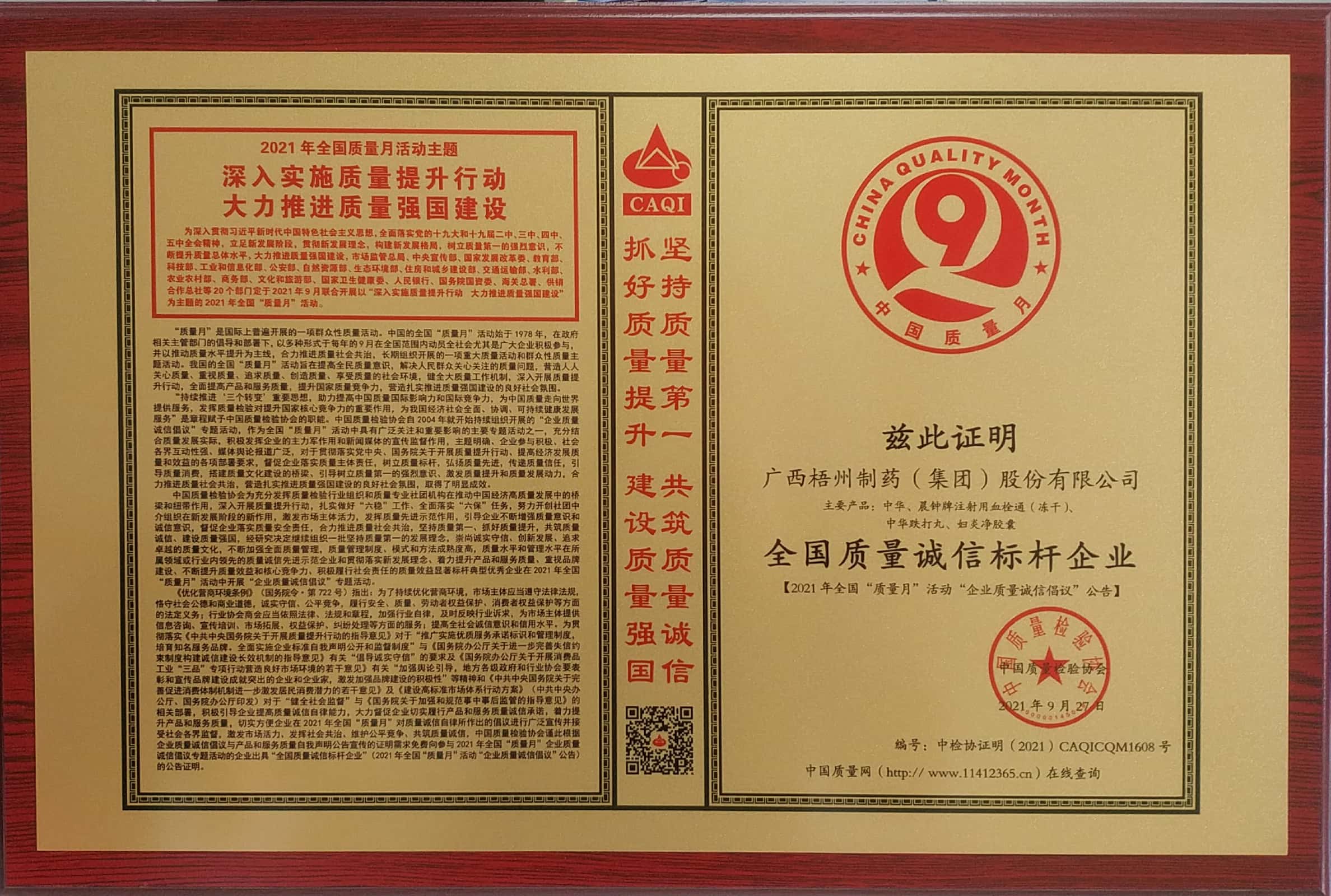 在2021年全國"質(zhì)量月"活動(dòng)中榮獲 全國質(zhì)量誠信標(biāo)桿 企業(yè)稱號。