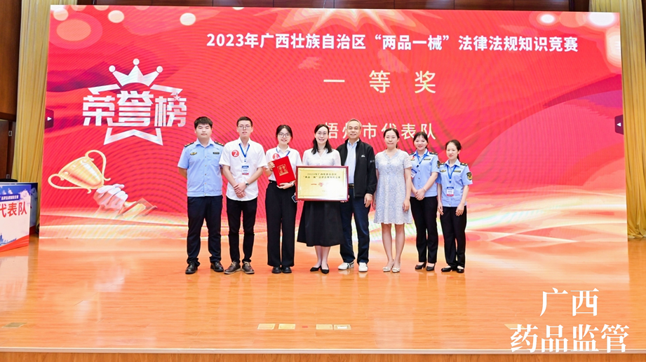 7月13日,由梧州制藥員工代表——質(zhì)量控制部呂金慧、質(zhì)量保證部李佳霖與梧州市場監(jiān)督管理局監(jiān)管人員組成的梧州市代表隊參加廣西壯族自治區(qū)“兩品一械”法律法規(guī)知識競賽,憑借過硬的專業(yè)知識、迅速的反應能力、高效的團隊配合力,與全區(qū)14個市代表隊展開激烈角逐,榮獲得2023年廣西壯族自治區(qū)“兩品一械”法律法規(guī)知識競賽一等獎。