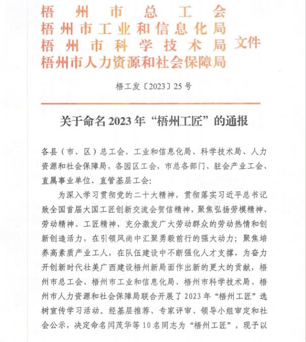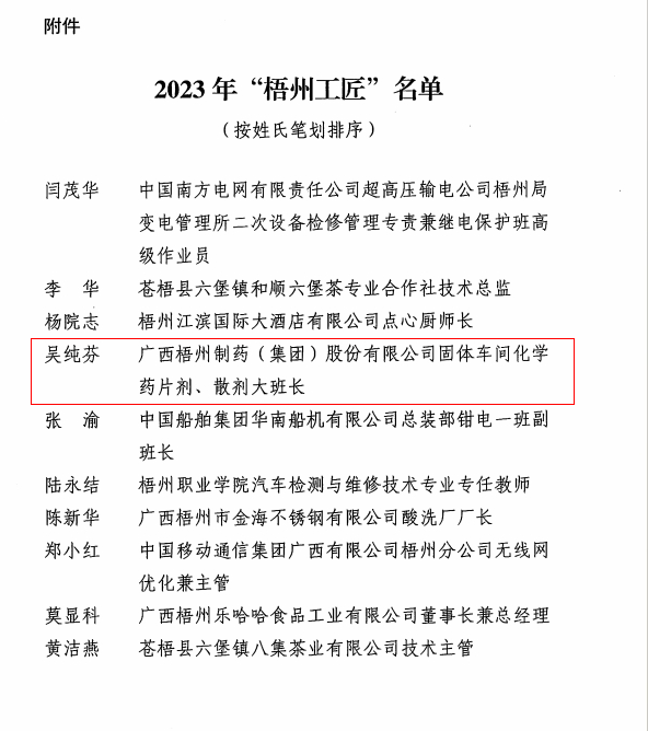 近日,梧州市總工會(huì)、梧州市工業(yè)和信息化局、梧州市科學(xué)技術(shù)局、梧州市人力資源和社會(huì)保障局聯(lián)合發(fā)布《關(guān)于命名2023年“梧州工匠”的通報(bào)》,梧州市有10名同志被選樹為“梧州工匠”,其中,梧州制藥固體車間化吳純芬獲此殊榮。