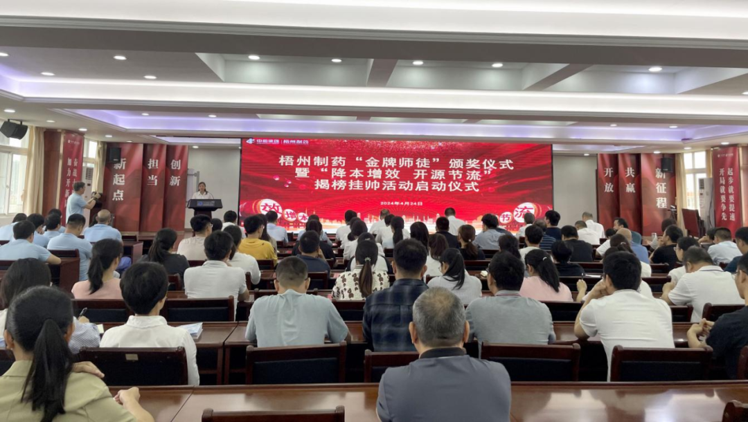 4月24日上午,一場感恩與奮進的“金牌師徒”頒獎儀式暨“降本增效 開源節(jié)流”揭榜掛帥活動啟動儀式隆重舉行。梧州制藥領(lǐng)導(dǎo)班子成員,各部門、各車間職工代表,及獲評星級的“金牌師徒”共150余人參加活動。