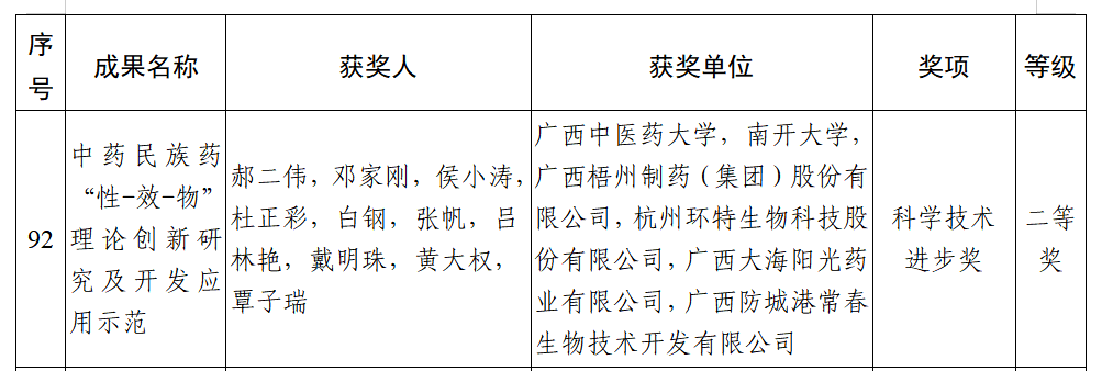 7月4日,2024年度廣西科學技術進步獎獲獎名單正式公布,廣西梧州制藥(集團)股份有限公司參與的《中藥民族藥“性-效-物”理論創(chuàng)新研究及開發(fā)應用示范》項目榮獲廣西科學技術進步獎二等獎。獲獎項目由大學院校和企業(yè)聯(lián)合完成,旨在通過創(chuàng)新的理論研究,揭示中藥和民族藥的藥效物質(zhì)基礎,提升傳統(tǒng)藥物的現(xiàn)代化水平,梧州制藥作為該項目的第三完成單位,彰顯了其在中藥現(xiàn)代化研究領域的實力。