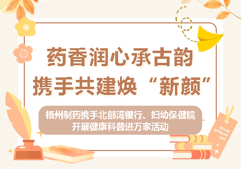 梧州制藥攜手北部灣銀行、婦幼保健院開展健康科普進(jìn)萬(wàn)家活動(dòng)藥香潤(rùn)心承古韻 攜手共建煥“新顏”7月19日上午,梧州制藥聯(lián)合廣西北部灣銀行梧州分行營(yíng)業(yè)部、梧州市婦幼保健院,在北部灣銀行大廳舉辦“中醫(yī)文化潤(rùn)心